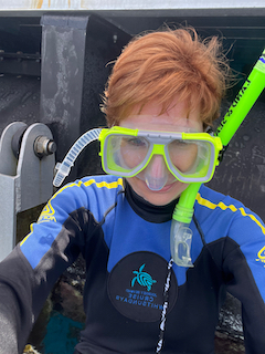 Ochranný oblek měl kapuci i rukavice, ale to jsme nepoužívala, protože v té době tam ještě ty žahavé medúzy ještě naštěstí nebyly. Evidentně tyto medúzy mají rády teplou vodu. Nohy jsou chráněné ploutvemi.