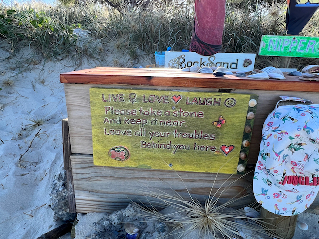 Největší problém bylo najít Marker č. 1, místo toho, aby tato značka byla na pláži, tak byla u parkoviště u vstupu do Philip Parku. Na Main Beach jsem našla velmi zajímavé místo, posuďte sami…. Nedalo mi to a i já jsem přidala na toto místo kamínek. Jestli jsem nějaké starosti měla, tak jsem je rozhodně “hodila za hlavu”.