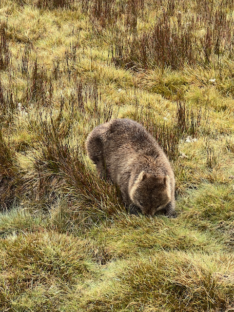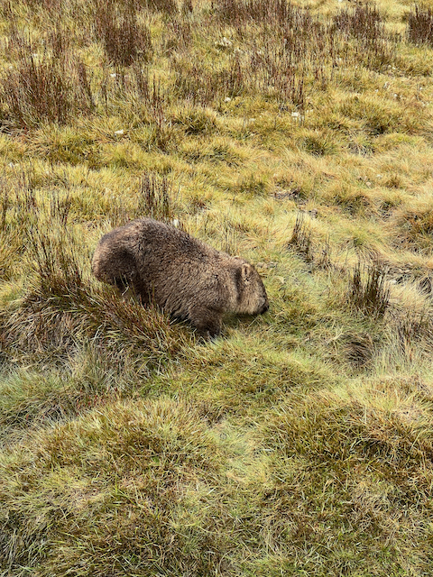 Začátek cesty byl velmi milý, potkala jsem vombata (wombat), které jsem den předtím viděla v přírodní ZOO. Vombati jsou běžní v Tasmánii, ale i v Austrálii. Vombati jsou vačnatci býložravci, kteří mají strašně pomalý metabolismus. Trávu, kterou sežerou, tráví až 14 dnů. Vombat vypadá jako neohrabané medvídě křížené s křečkem. Zdání klame, toto zvíře dokáže vylézt na strom, ponořit se do vody (šla jsem kolem Wombat poo, ale žádného jsem neviděla, asi byli všichni ponořeni ve vodě 😂) nebo utéct, protože jsou schopni utíkat rychlostí 40 – 60 km/hod. Je pravda, že jsem je klidně mohla přehlédnout, protože jsou stejně barevní jako místní příroda.