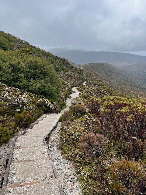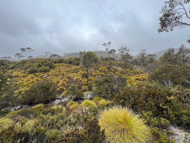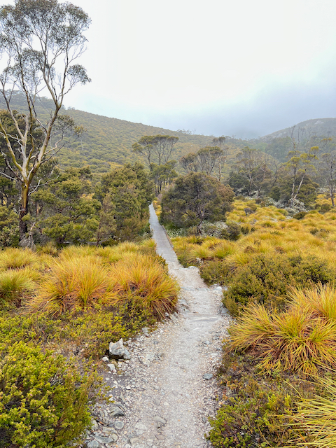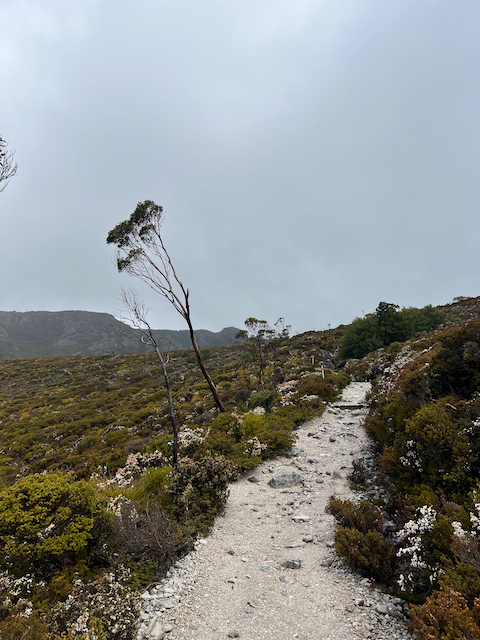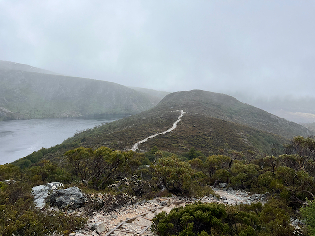 Nejvyšší hora v Cradle Mountain je 1545 m.n.m. Já jsem zdaleka nevylezla tak vysoko, sice jsem měla namířeno na vyhlídku Crater peak, ale pod vrcholem jsem se ještě s jedním párem otočila, protože strašně foukalo a byla mlha, že lézt na vyhlídku byl úplný nesmysl. Nehledě na to, že to bylo i nebezpečné, protože se tam lezlo hodně strmě.