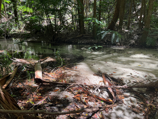 Při procházce deštným lesem, který je mimochodem unikátní na písečném ostrově, jsme měli možnost vidět krásný, průzračný potok. Voda byla tak čistá, že se z něho dalo pít, takže jsme si všichni natočili u “Central Station” čerstvou vodu, abychom to tady v tom horku přežili.
