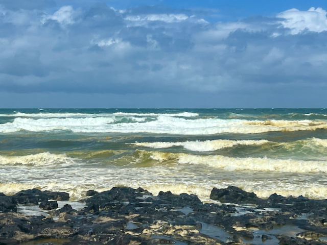 Další část okružní jízdy ostrovem vedla po pláži, po které se jezdí jako po normální silnici – dokonce je to klasifikované jako “dálnice”, maximální rychlosti je 80 km/hod (to bych chtěla vidět, jak by to vypadalo, kdybychom jeli 80 km/hod, už takhle se celý autobus třásl a vypadalo to, že za sebou ztrácíme kusy autobusu. Úplně normálně se tady opravdu nejezdí, záleží na tom, jestli je příliv nebo odliv, jaké auto jede v protisměru a mnoho jiných okolností se musí brát v potaz. Základem je bezpečnost. Pokud auto nemůže jet vodou nebo naopak pískem, tak prostě jede v protisměru. Moře na východním pobřeží bylo trochu rozbouřené a to díky cyklonu Gabriel, který řádil východně od ostrova v moři a řítil se na jin na severní ostrov Nového Zélandu.