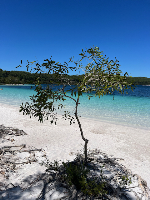Těžko se dají popsat pocity, které člověk má u takového jezera. Byla to čistá nádhera, takový malý ráj na zemi. Jezero je přesně takové, jak si ho člověk může představit, vlastně mnohem hezčí.  Ani tady nebylo moc lidí, protože tady na ostrově jsou většinou jen skupiny, které se tu nepotkají a pár individuálních turistů, kteří se sem vypraví se svými terénními vozidly. Zajímavé je, že se u jezera nesmí jíst a to hned ze dvou důvodů. Jeden jsou psi Dingo a druhý je, aby nedocházelo ke znečištění jezera. Oběd jsme měli zhruba 150 m od jezera. Samozřejmě za plotem, abychom nebyli předmětem zájmu psů Dingo.  Opalovací krém je tady dovoleno použít, rozhodně ale ne hned před vstupem do vody.