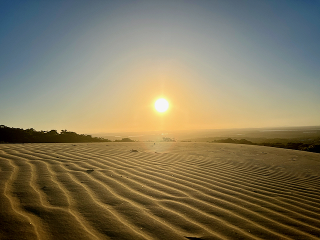 Z ostrova Fraser jsme se vrátili k večeru, tak jsem se rozhodla se ještě projít po Rainbow Beach a hlavně se podívat na Sandblow (pohyblivá duna). Aniž bych to nějak plánovala, tak jsem se ocitla na Sandblow v době, kdy zapadalo sluníčko. A tak jsem zažila výjimečný okamžik, který jsem ani neplánovala.