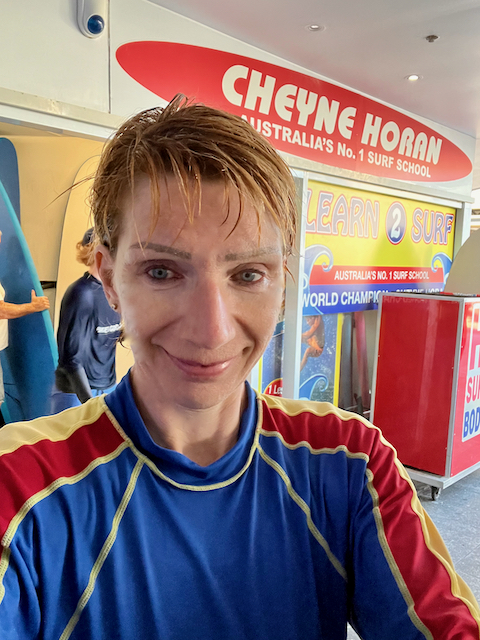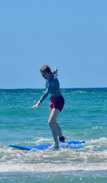 Na další hodinu jsem se dostala až v lednu 2023, kdy na Gold Coast byl i Vojta. Ten se do surfování pustil s vervou. Zato já jsem byla dost marná. Škoda byla, že jsme si to s Vojtou nemohli vyzkoušet spolu, měli jsme totiž úplně opačný režim – on surfoval, když já jsem byla ve škole a já jsem surfovala (občas o víkendu), když on měl volno a někam jel.